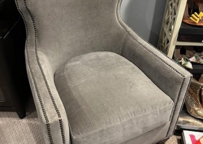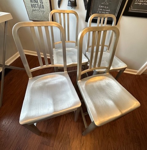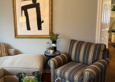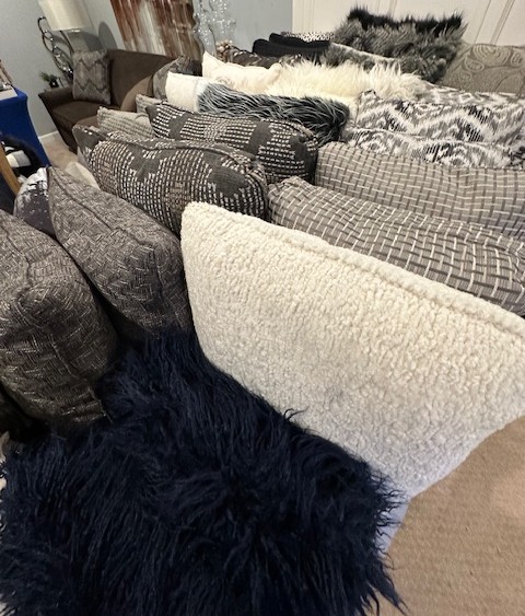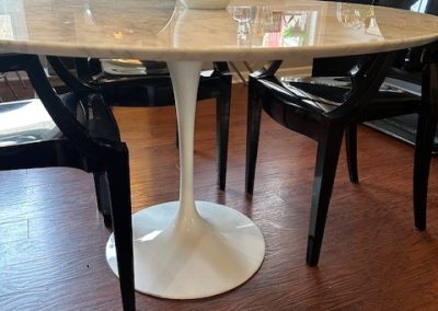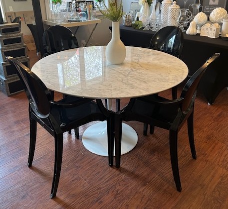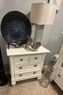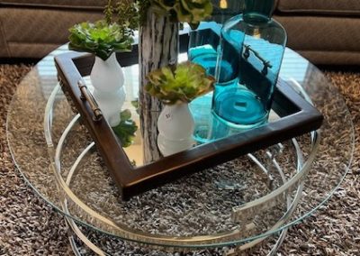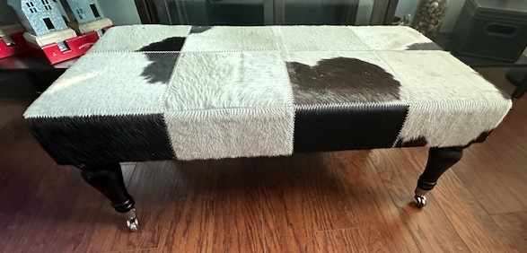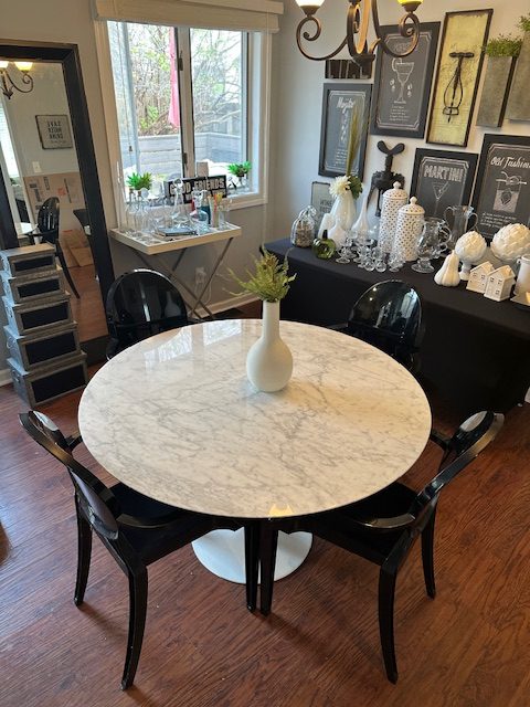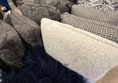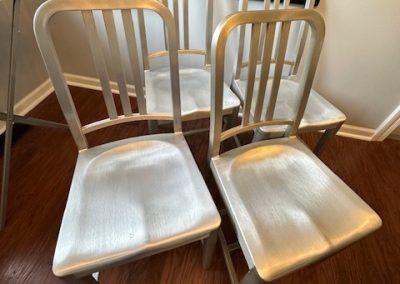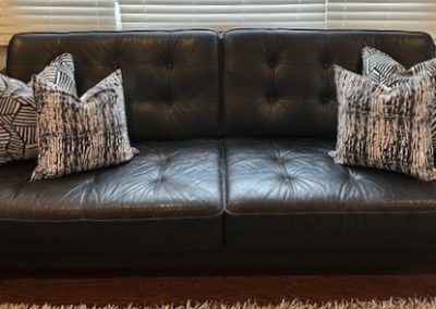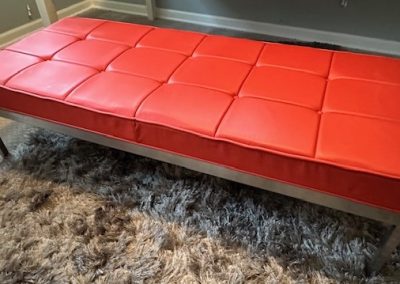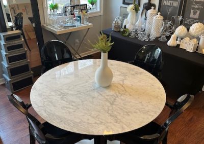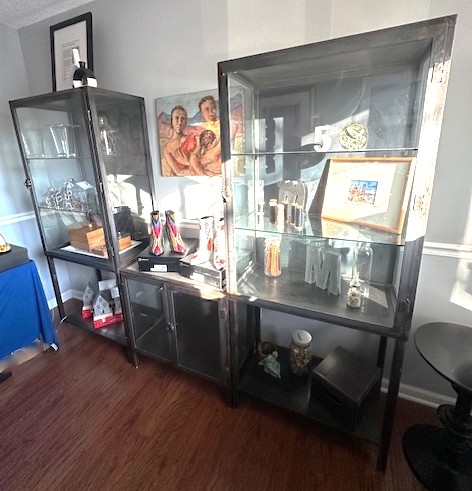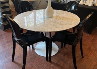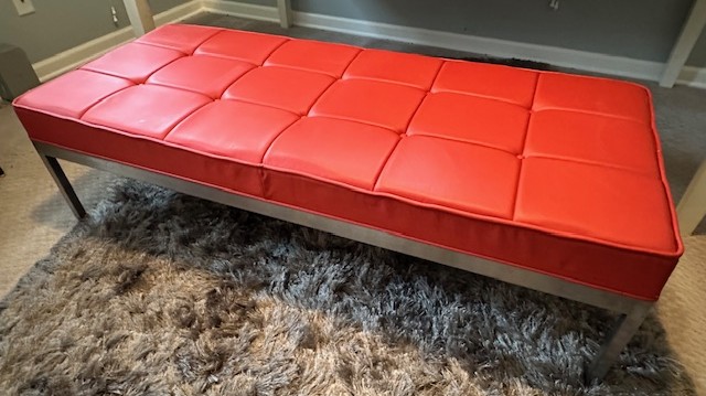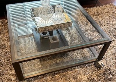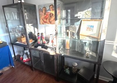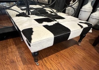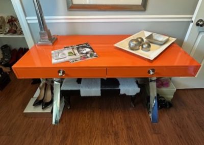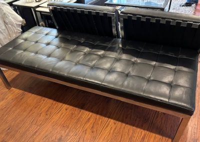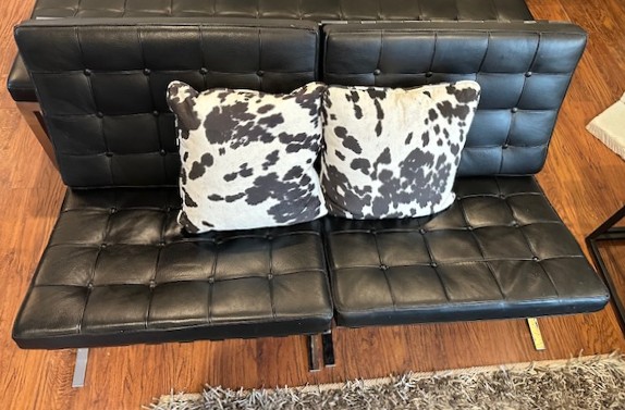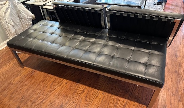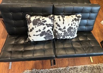 Rowe accent chairs, Glass/chrome coffee table and side tables, Rowe Sectional, large wing-back Bassett chairs (black/shite pattern), Rolling cowhide footstool, mirrored credenza, Room & Board day bed/bench, Barcelona style chairs (black and chrome), Marble/Steel nesting tables, Rolling glass top coffee table (industrial style), Black leather sofa, mirrored credenza, Full-length mirrors (several), small metal sideboard, Johathan Adler Orange desk and lamp, Industial cabinets, Blue Basset square blue tables,