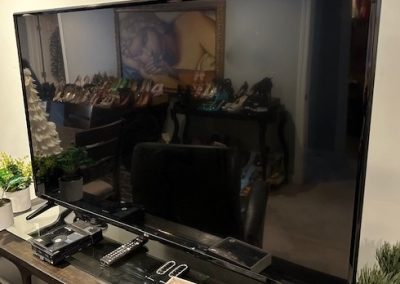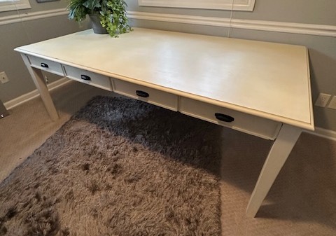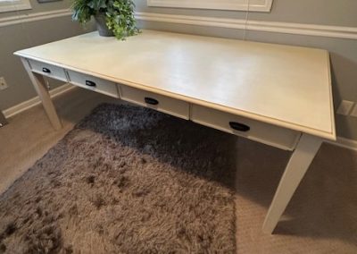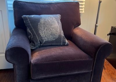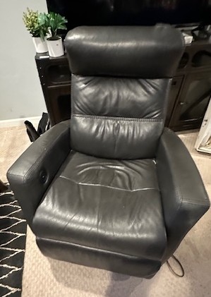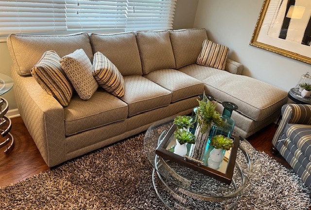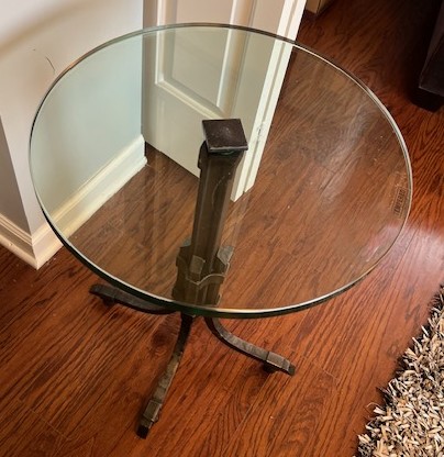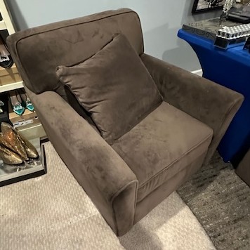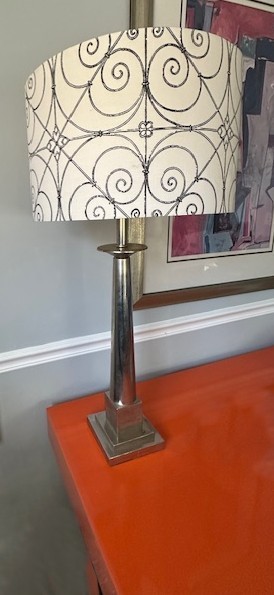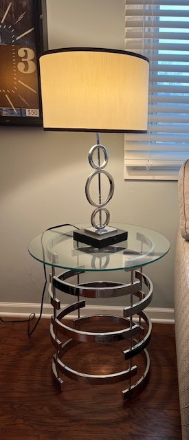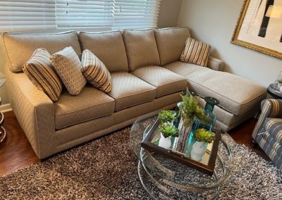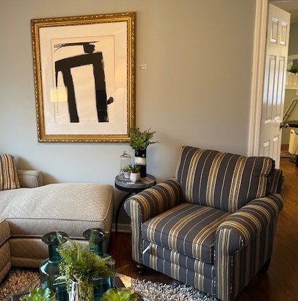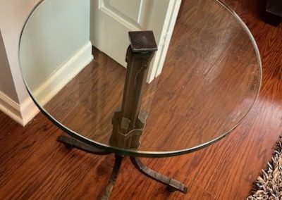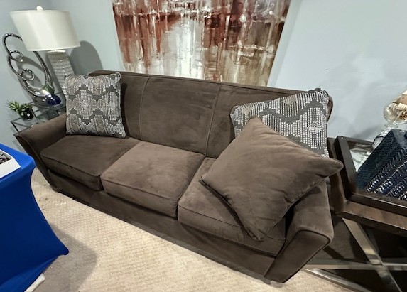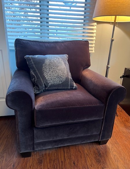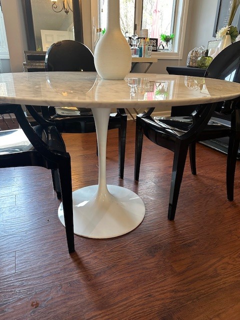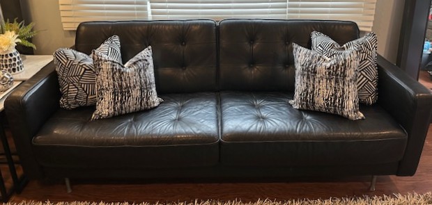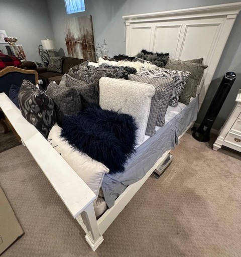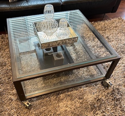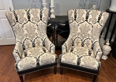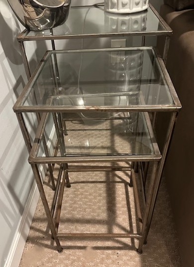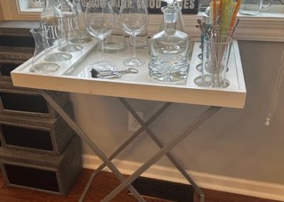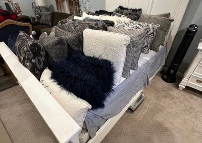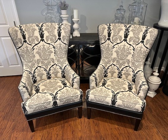 Rowe accent chairs, Glass/chrome coffee table and side tables, Rowe Sectional, large wing-back Bassett chairs (black/shite pattern), Rolling cowhide footstool, mirrored credenza, Room & Board day bed/bench, Barcelona style chairs (black and chrome), Marble/Steel nesting tables, Rolling glass top coffee table (industrial style), Black leather sofa, mirrored credenza, Full-length mirrors (several), small metal sideboard, Johathan Adler Orange desk and lamp, Industial cabinets, Blue Basset square blue tables,