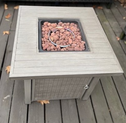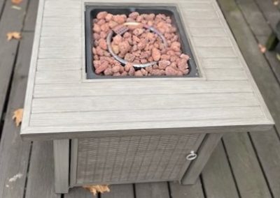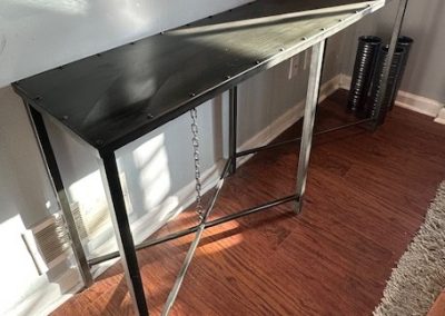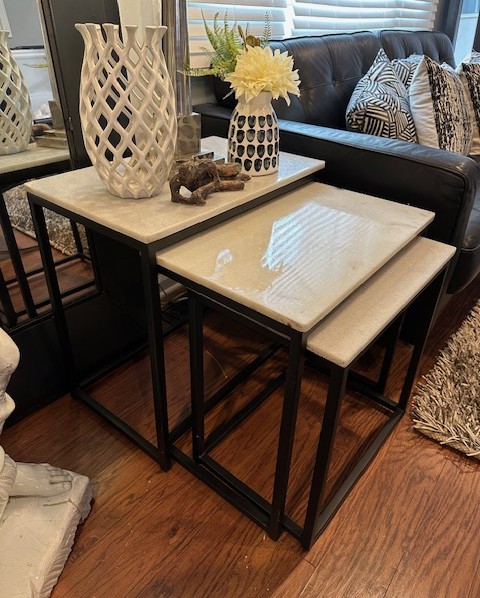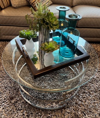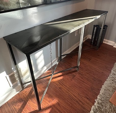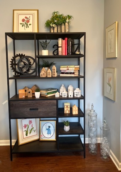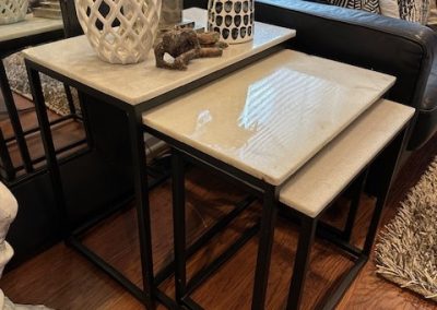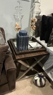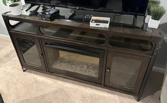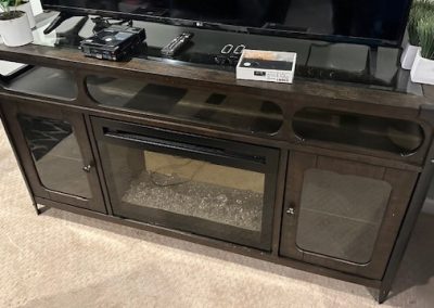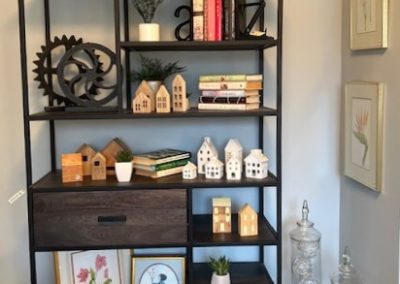 Universal grey chair, Bauhaus sofa, chair and ottoman, Dimplex Paige brown media console with electric fireplace, glass and metal nexting tables, Pepe Cortes metal stools, Magnolia blue chair, Dressel cabinet, shelving units, several small tables, Rustic Industrial bookcases and shelving units.
