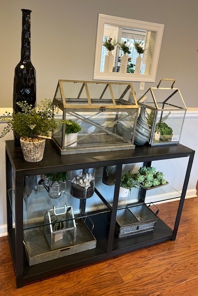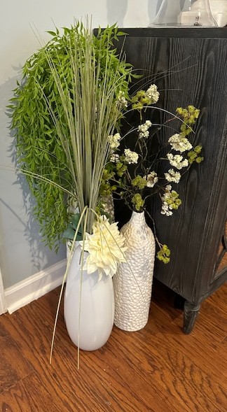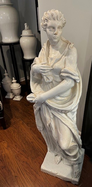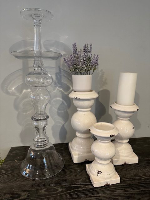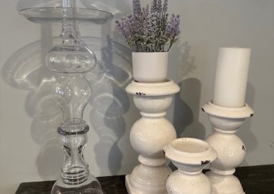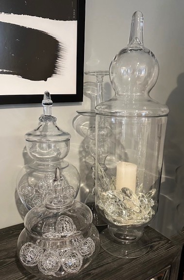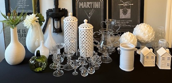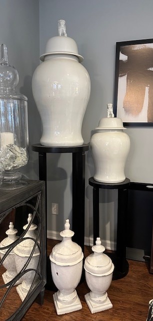 Decorative items, a house full of ceramic vases, several sized ginger jars, beautiful glass decorative, large Urns with Foo Dog décor, large wooden wall clock, black wooden pedistals,  sold wooden handled table trays, cream metal lanterns, and other whimsical décor.