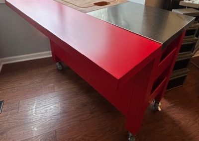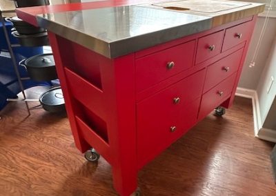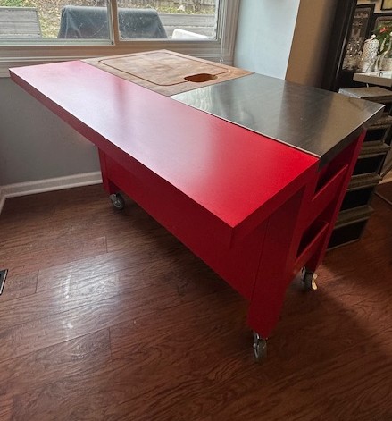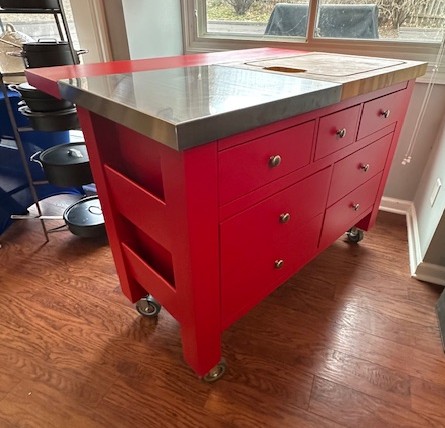 Slumberland Red Gourmet kitchen island with stainless steel and butcher block top.