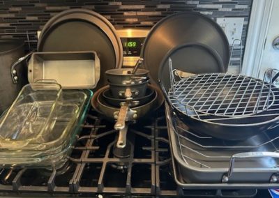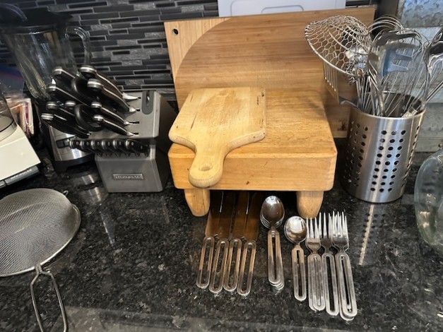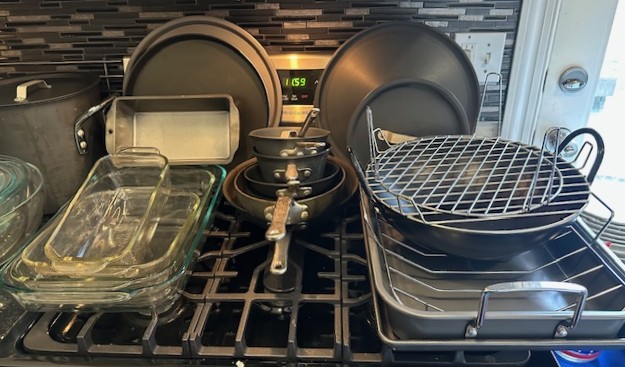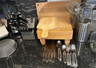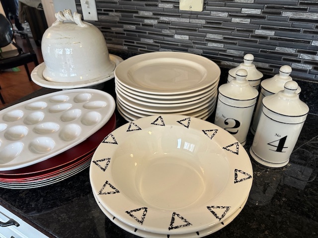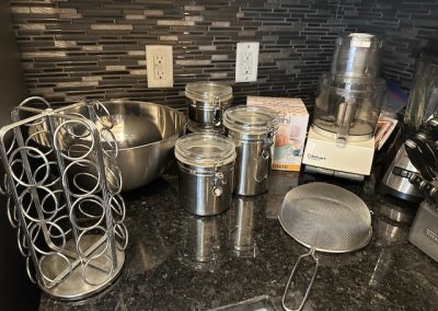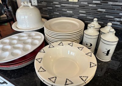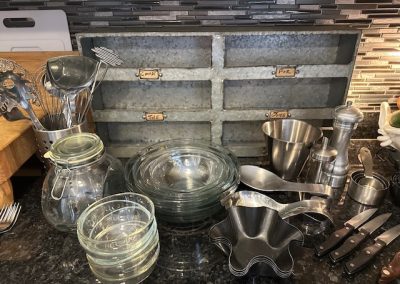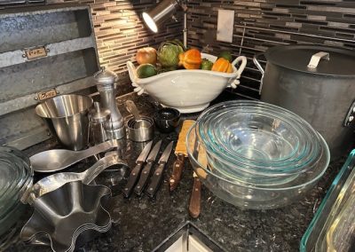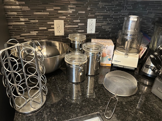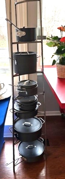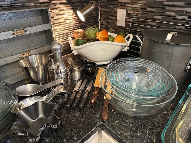 Cuisinart food processor, stainless canister set, KitchenAid knife set, butcher block cutting board, Roberts flatware set for 4, stainless bowls, glass bowls, stainless utensils, baking pans, unique Enclume 6-tier gourmet cookware stand, collection of Calphalon pots and pans, ceramic bowls, deviled egg dish, cake plate, plates, soup terrine and more.
