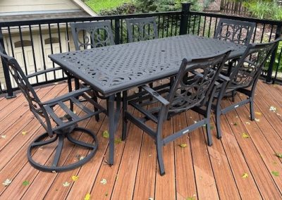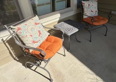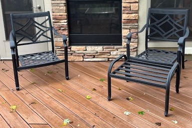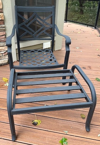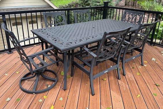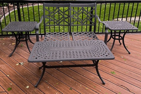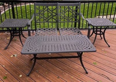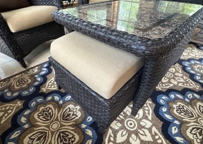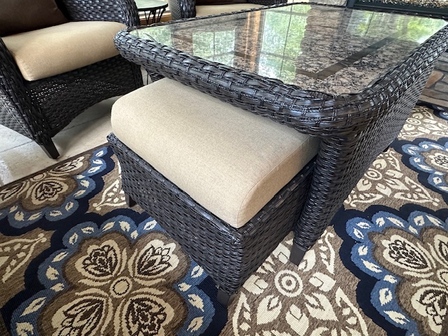 Thomasville 7pc outdoor table set, bench, coffee table, side tables, chairs and ottoman.