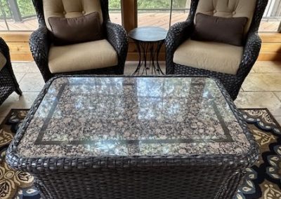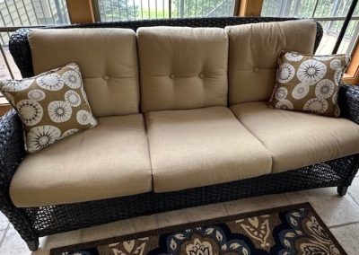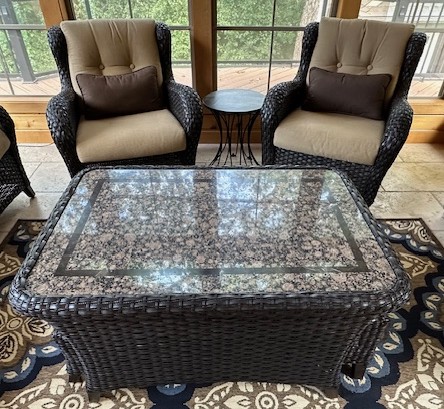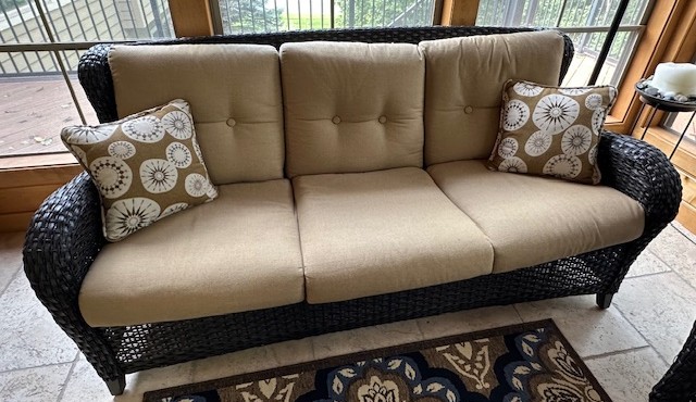 Sunbrella all weather wicker sofa with cushions. 3 piece set includes two wingback chairs with coffee table (and tuck under ottomans).