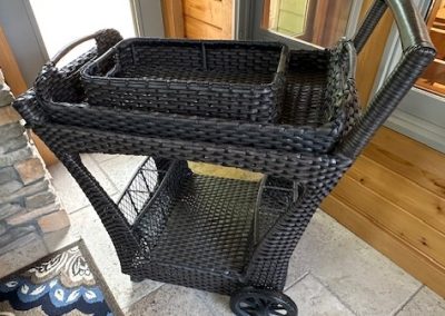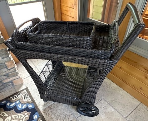 Sunbrella all weather wicker rolling bar cart with removable trays.