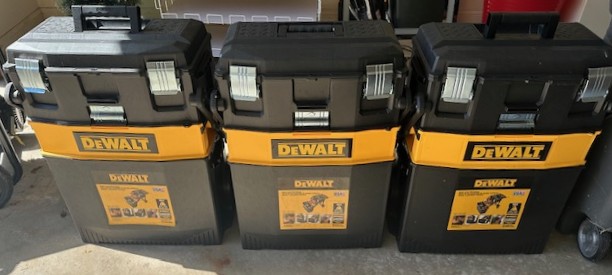 Steel firewood storage racks, Shop Vac, heavy duty hand cart, 5250 Watt Companion Generator 10 HP, Techline Cabinets, DeWalt Tool Boxes, Toro Ultra Electric Blower Model 51599