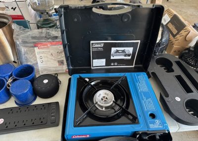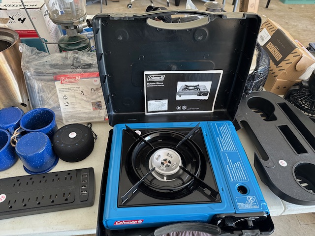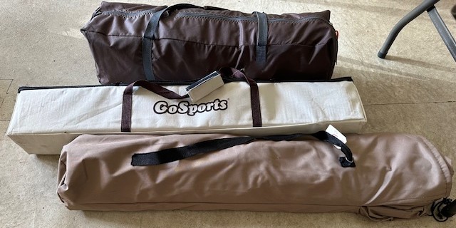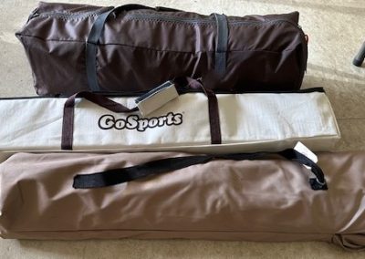 Cot, camping stove, expandable dressing tent, lantern, tent, netting, yard games